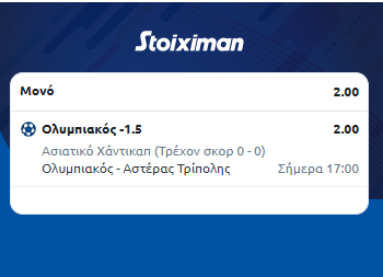 17:00 Ολυμπιακός – Αστέρας Τρίπολης: 1 -1,5 (2.00) / 10 units