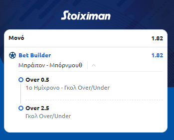 Το bet builder over 0,5 ημίχρονο & over 2,5 συνολικά γκολ αγώνα προσφέρεται σε απόδοση 1.82 και μου αρέσει ιδιαίτερα για τα δεδομένα της αναμέτρησης, για 10 units medium stake ως επένδυση.