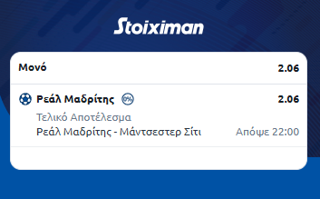 22:00 Ρεάλ Μαδρίτης – Μάντσεστερ Σίτι: 1 (2.06) / 10 units